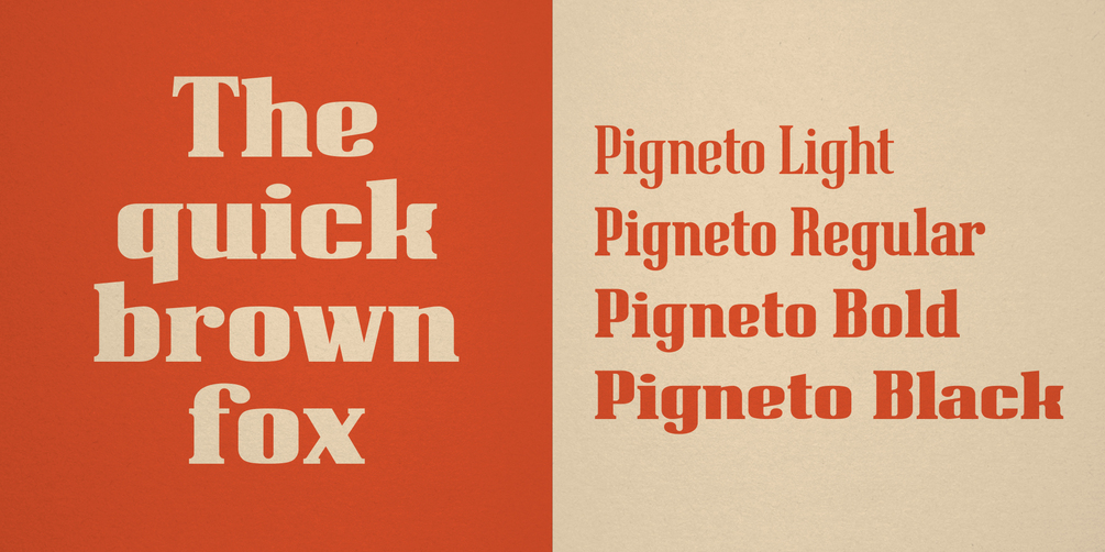 With a solid personality and elegant looks Pigneto is a mid-century inspired serif typeface. Versatile and meticulously crafted the Pigneto family consists of eight weights offering a bold array of flavours, seamlessly capturing the essence of heritage while embracing modern aesthetics.